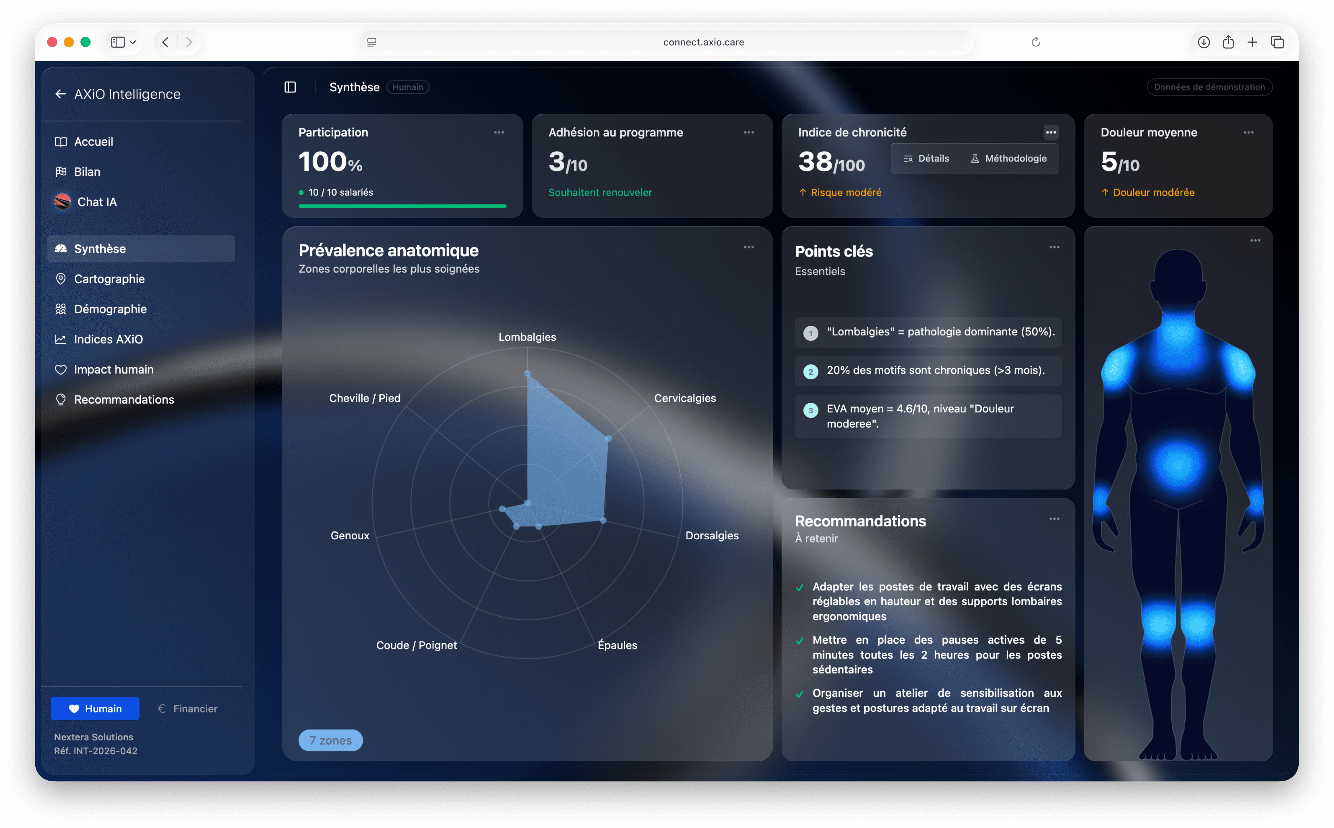 AXiO remplace l'intuition par l'intelligence — des ostéopathes certifiés, un rapport d'impact structuré – le tout livré en 48 heures.